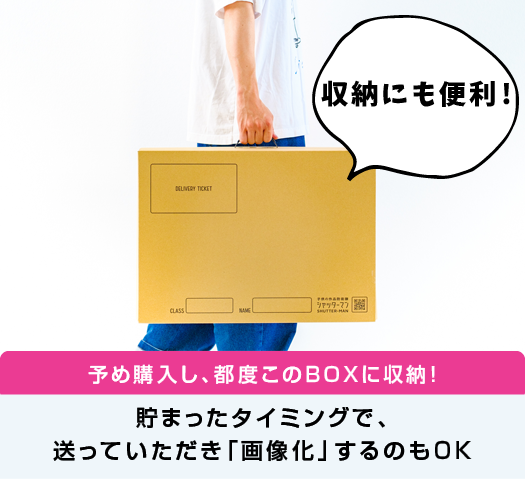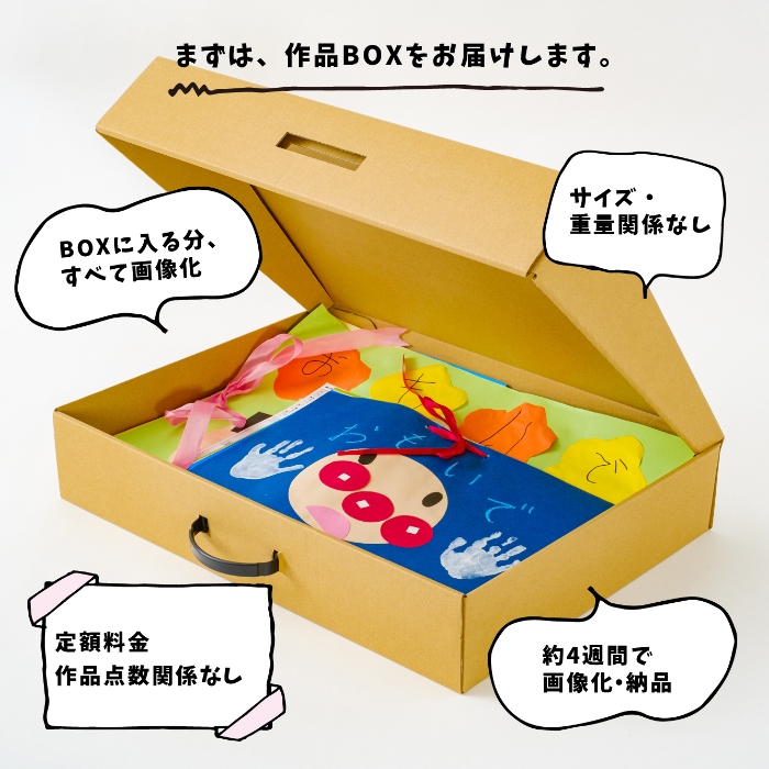 今すぐ「画像化」するためのご注文だけではなく、ある程度子どもの作品が貯まったタイミングでBOXを送っていただいてもOK!注文状況をデータベースで管理していますので、ご安心ください。将来に向けて計画いただくのにも最適です。