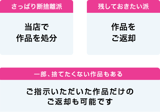 撮影画像化後のお子さまの作品はこちらで処分することができます。注文時に当店で画像処分を希望されるのか再度作品を返却してほしいかのどちらかを必ず選択して注文ください。なお、作品の保管期間は注文時から1ヶ月です。またデジタル画像の保管期間も1ヶ月となっております。